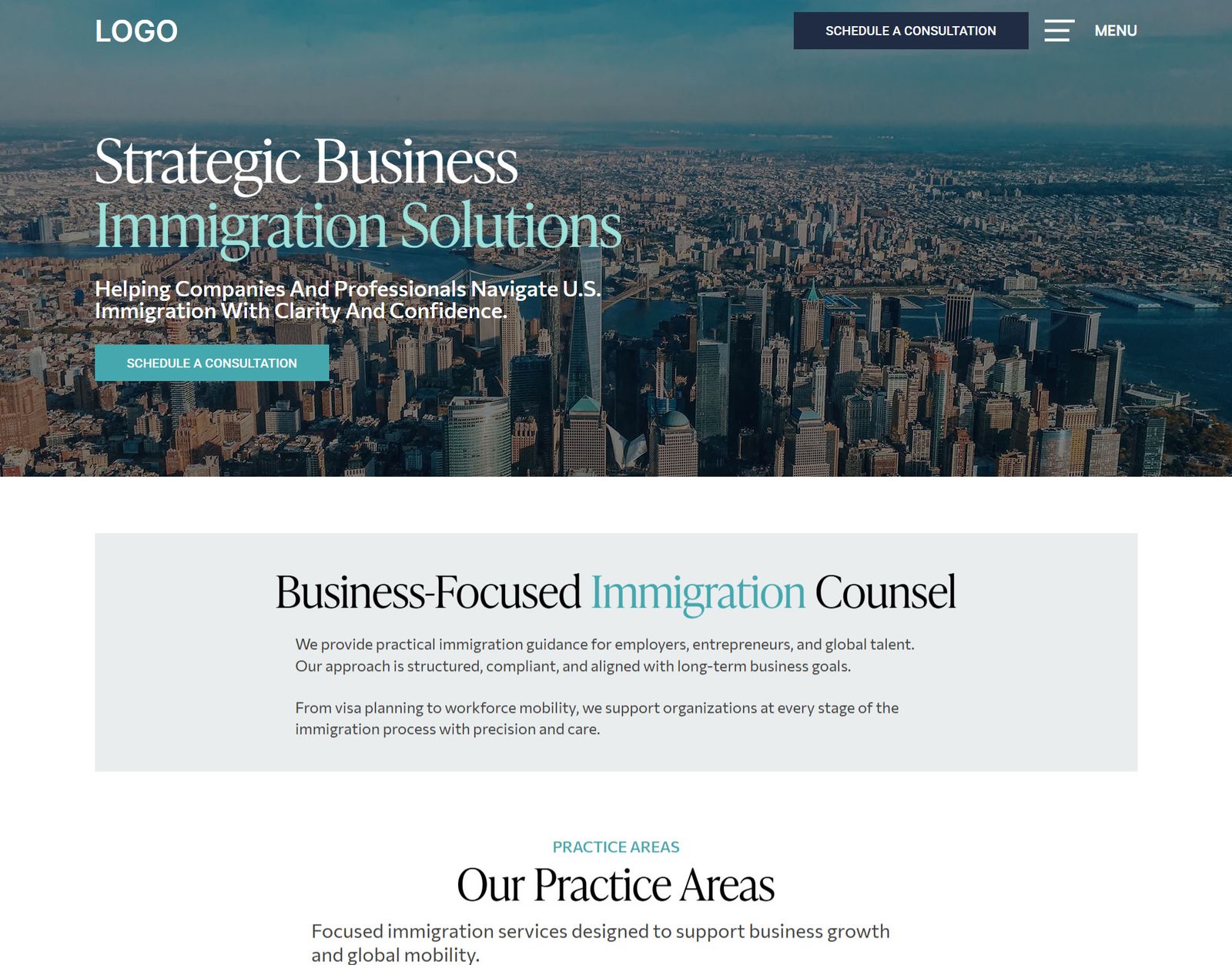 Professional design designed for immigration attorneys helping businesses navigate complex visa and work permit processes.